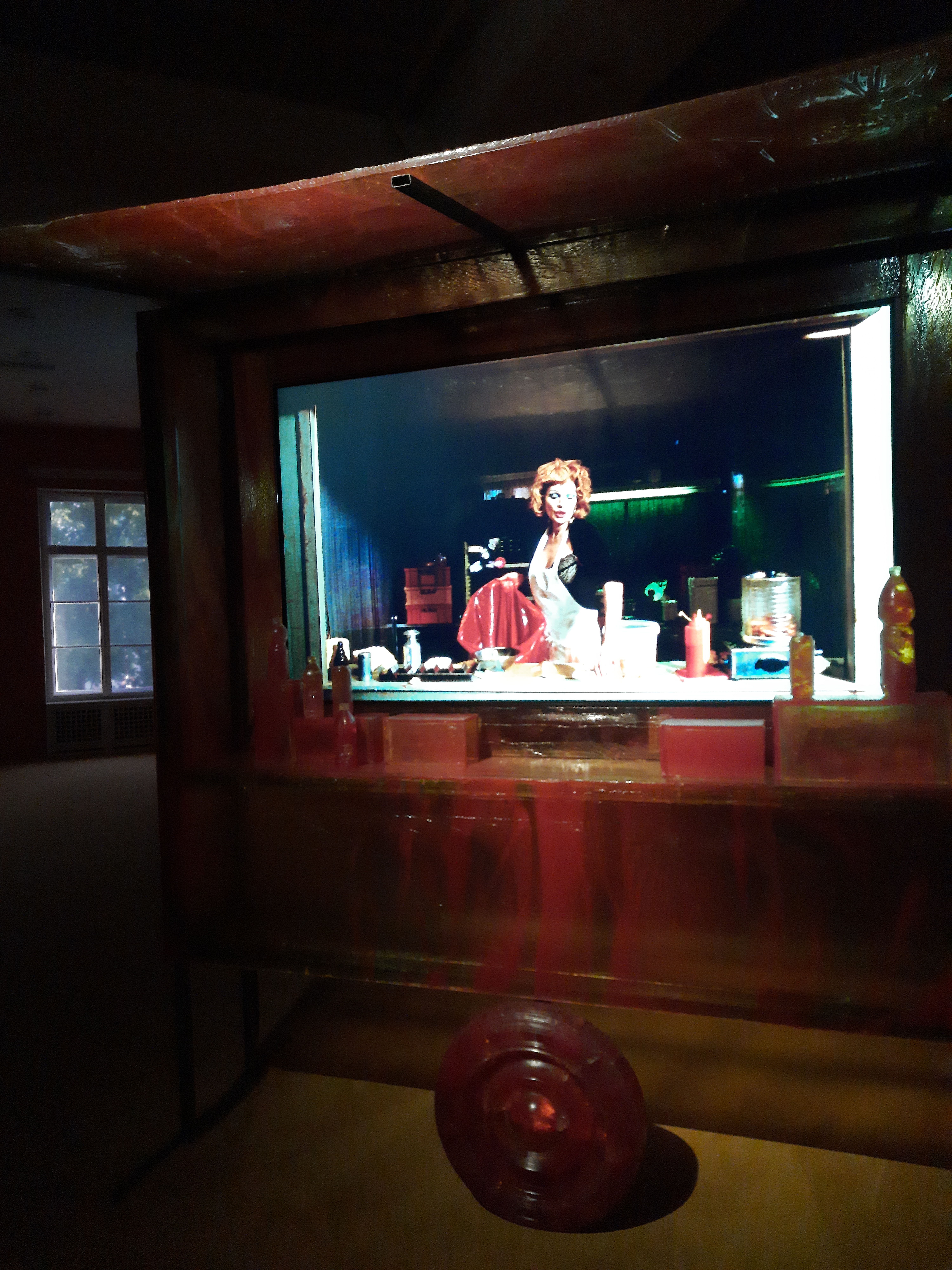 Pierwsze piętro to wystawa wideo o marzeniach sztucznej inteligencji. Po co? Przecież AI nie ma marzeń tylko jest wyplutą papką ze średniej on-line ludzkości. Ale obejrzałam, żeby zobaczyć średnią wyciągniętą ze średniej. Taki film Barbie. Miękkie kontury zalane różem. Może się podobać jak guma balonowa o smaku gumy balonowej. Drugie piętro to też wystawa wideo, ale tym razem człowiek. Joanna Dudley I jej